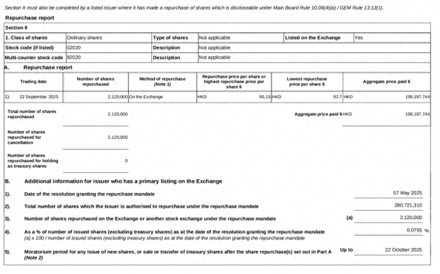 9月22日,安踏体育(2020.HK)在港交所公告,于9月22日耗资1.99亿港元,回购212万股公司股份,回购价格区间在92.7港元至95.15港元。